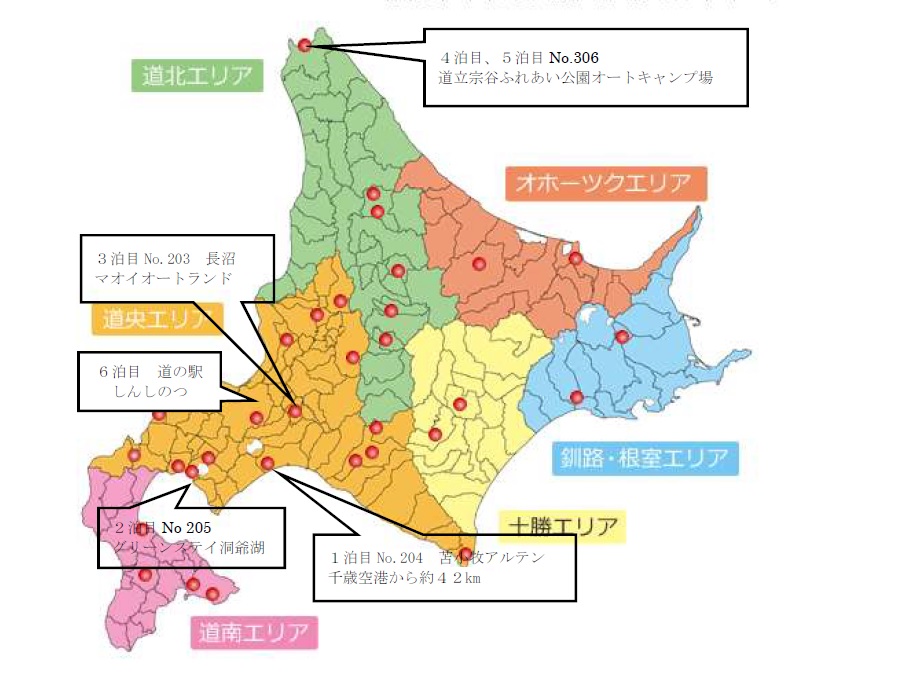 昨年の夏、北海道の道央と道北を6泊7日で回り、走行距離は1500Km でした。伊丹から空路新千歳へ、そこで車をピックアップして、東京から来た息子家族と合流すると気ままなキャンピングカー旅行の始まりです。行程は下図の通りで涼しく快適でした。