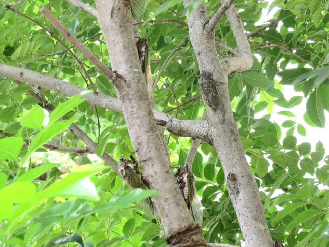 しかし、今枚方にはアブラゼミはほとんどおらず、クマゼミが占領しています。そして午前11時ごろになると、鳴き声は一斉に止み、蝉の声は一切なくなります。いなくなったのかと思うと、庭先の木々にはクマゼミが重なるほど集まって、静かに止まっています。鳴く時間が決まっているかのようです。(気温、湿度などによって鳴く状態が変わります。雨が近づくと鳴きません。)