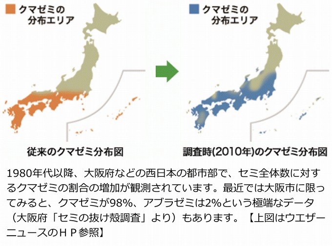いろんな情報から推察すると、原因は大きく2つにまとまるようです。一つは地球温暖化によりアブラゼミの孵化が早まり、幼虫になって地中に移動する時、アリなどの天敵に襲われ易いこと、最近大阪の土が硬くなっておりアブラゼミは育ち難いが、クマゼミは固い土でも掘り進むことができ生き抜きます。もう一つは、クマゼミは成虫になってからの天敵回避能力に優れているそうです。結果、枚方近郊ではアブラゼミの声が聞けなくなりました。