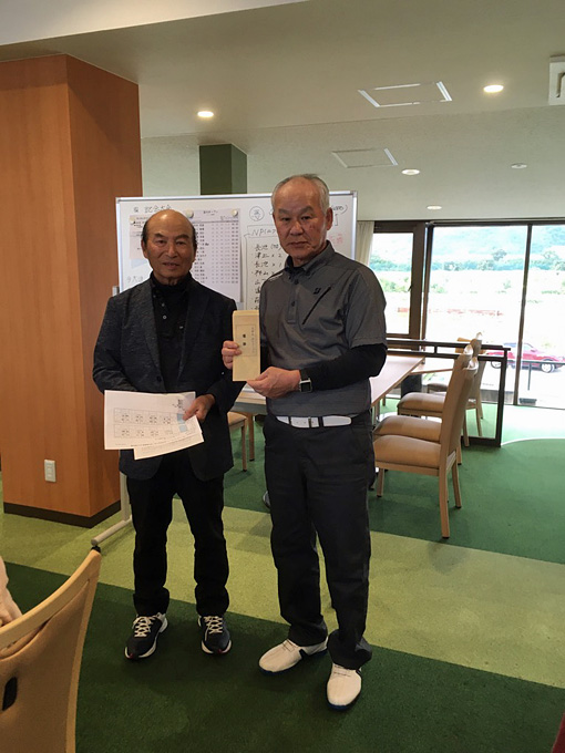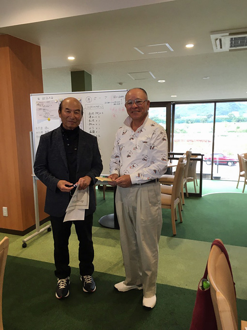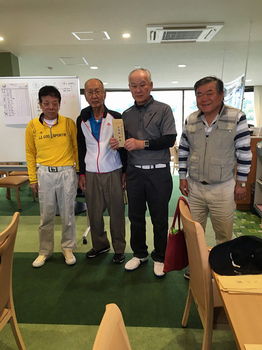 ”優勝”は、角井 昭雄さん。グロス”84”、ネット”66”の素晴らしいスコアで、昨年6月以来(通算7回目)の優勝を飾られました。おめでとうございます。今回、記念大会として団体戦も行われ、INスタート1組目の(遠藤 一朗、角井 昭雄、小山 吉雄、山下 芳輝)の皆さんが優勝されました。その他、BM賞(16位:藤田 光次さん)、ゾロ目賞(11位:飯村 光晴さん)、大波賞(津上 敏廣さん)、小波賞(遠藤 一朗さん)、水平賞(吉田 昌弘さん)も授与されました。