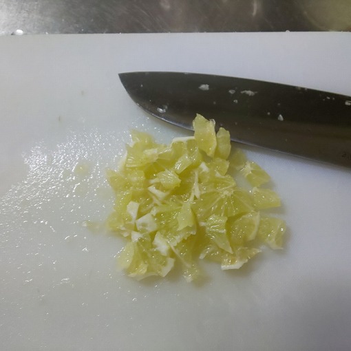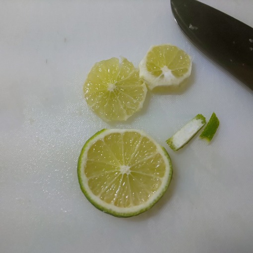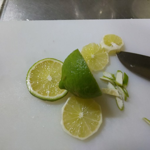 ライム半分をスライスし、(私は見た目が奇麗なので皮は残したいのですが)皮と綿が気になる方は包丁でそぎ落とします。5ミリ四方くらいの粗みじん切りします。先ほどのグラスにみじん切りしたライムとライムジュース=1杯とテキーラ=4~7杯と氷4~5個を入れ軽くステアし(「混ぜる」をカッコ良く言っただけ)「マルガリーニャ」の完成です。炭酸水で割って飲む「マルガリーニャ・ハイボール」も絶品です。試してみて下さい。