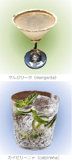 一方、ライムを使った有名なカクテルの一つにブラジルの「カイピリーニャ」があります。ポルトガル語で「田舎の娘さん」という意味で、ロックグラスにぶつ切りにしたライムを入れ、砂糖を加えてつぶし、砕いたアイスを加え、ピンガ(さとうきびが原料のブラジルのスピリッツ)を注ぎ、軽く混ぜて出来上がりです。ピンガが結構強いお酒なのに甘くて飲みやすいので ブラジルの出向者や出張者の中には飲み過ぎてフラフラになった方もいらっしゃるのでは・・。