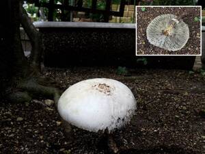 このキノコは、主に熱帯・亜熱帯地方で見られる種類で、国内では沖縄などでしか確認されていませんでしたが、現在はかなり広い範囲で見られるようになり、春から秋に草地などの肥沃な土壌、市街地、公園などに群生するそうです。大雨の跡、たった1個だけで突然に発生したキノコに何となくかわいさも感じました。とは言っても毒キノコ、過去には間違って食した人が救急車で運ばれた例もあるとの記事もありました。
