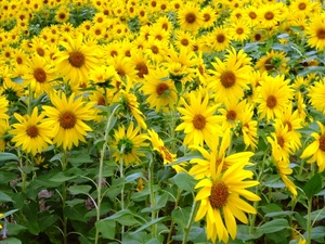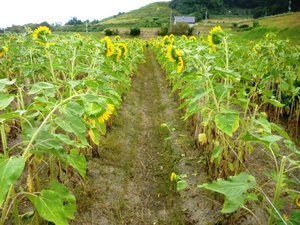 ヒマワリ畑の写真を見るといつも同じような印象をうけます。見事に同じ向きに咲いていることが一因です。ヒマワリは向日性があり、成長期の葉および茎頂は太陽の動きを追いかけ、夜間にもとに戻り夜明け前には東を向くようです。そして、開花が完了した全開の花は、追随性を失くし東向きに固定されます。