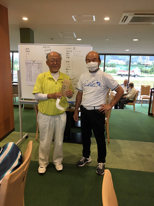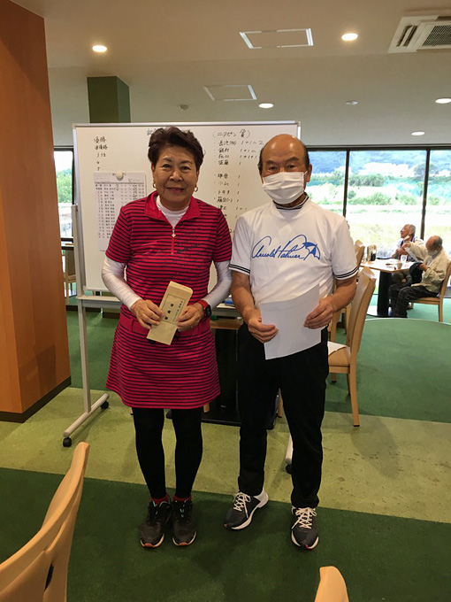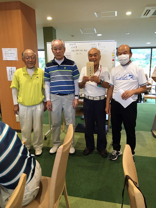 ” 優勝 ” は、在川 眞さん。グロス ”79”、ネット ”62”の素晴らしいスコアで、昨年9月以来(通算4回目)の優勝を飾られました。今回、記念大会として団体戦も行われ、OUT5組(飯村 光晴、在川 眞、角井 昭雄)の皆さんが優勝されました。
