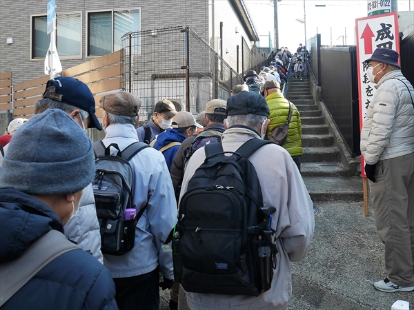 「かほりまちテラス」横の広場の右側から、少し進み、石段を上がっていきます。石段の幅が狭いため、長い行列にになってしまいました。