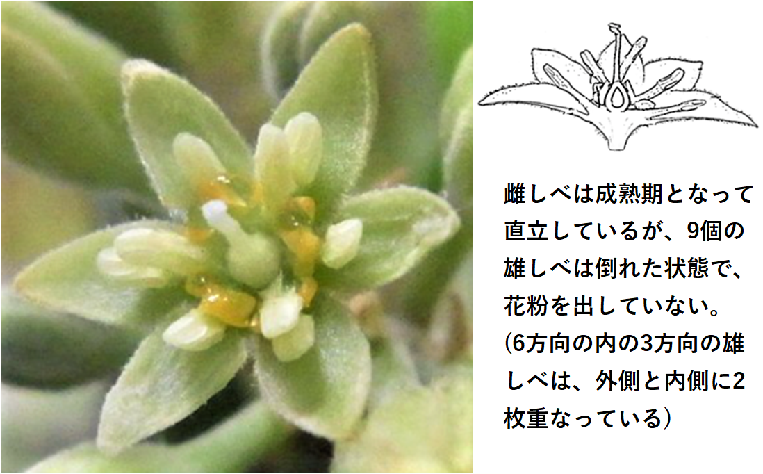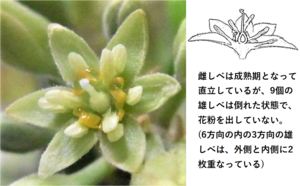 雌性先熟のものはこの逆で、雌しべが先で、雄しべの花粉があとです。