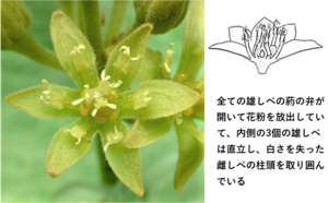 ・雌雄異株(しゆういしゅ):雄花、雌花がそれぞれ別の個体(雄木・雌木)となっているもの。
