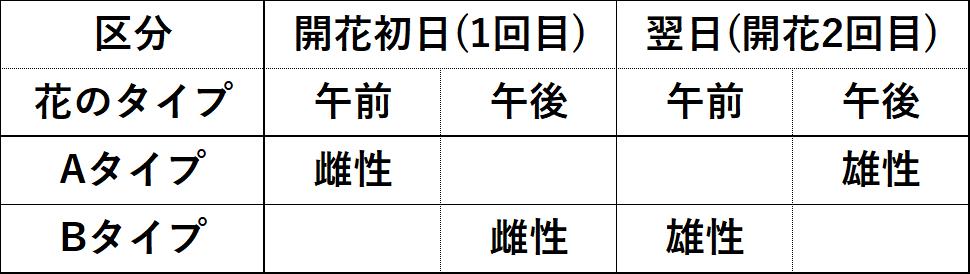 ・”B”タイプは開花1回目は午後に雌性で開花し、翌日の午前、雄性で2回目の開花をする。