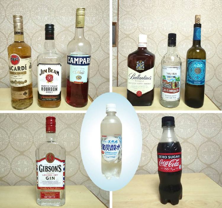 参考;リカマンで買うと、カンパリ、ジンビーム(バーボン)、バカルディ(ラム)、白ワイン、テキーラ、バレンタイン、ジンが全部で1万円以内で買えます。炭酸は、スーパーの「サンディー」や「業務スーパー」で買うと500mlペットボトルが45円とかで買えます。
