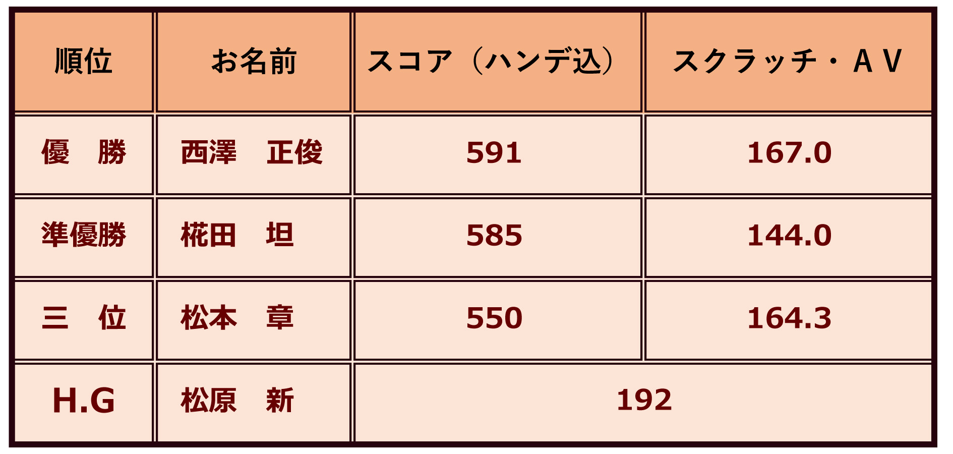 優勝は、豪快な投げ方で久しぶりの安定した好スコアで、当クラブ会長の西澤正俊さんが通算3回目の優勝を果たしました。