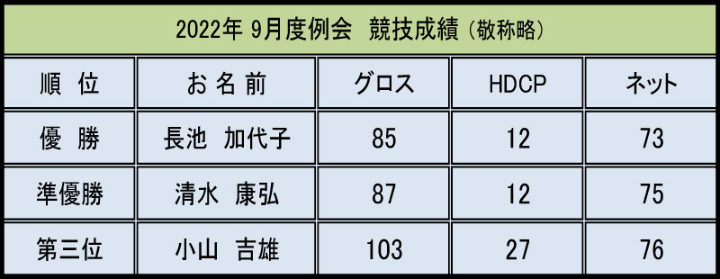 ” 優勝 ” は長池 加代子さん。グロス ” 85 ”、ネット ” 73 ”のスコアで、2005年7月以来(通算 2回目)約12年ぶりの優勝を飾られました。おめでとうございます。