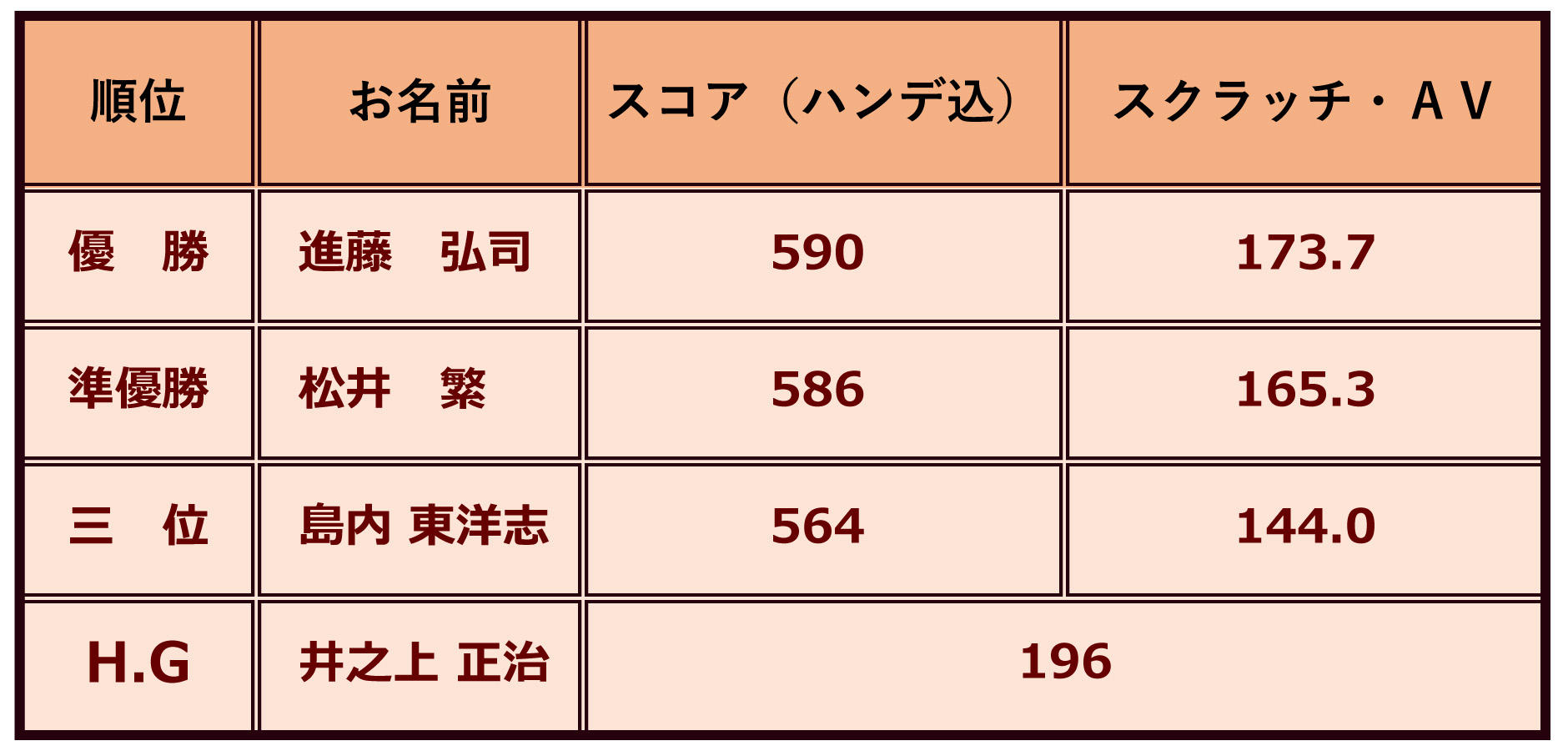 今回優勝は、しばらく不調で低迷していた進藤弘司さんが、安定した高得点で2位に4ピン差で逃げ切り、7回目の栄冠に輝きました。