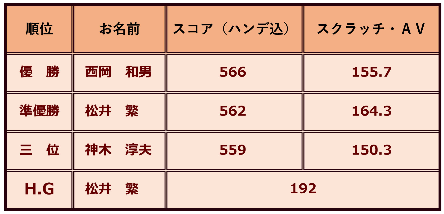 今回優勝は、参加2回目の西岡和男さんが、2位と4ピン差、3位と7ピン差の接戦を制し、堂々の初優勝を飾りました。