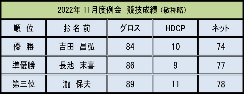 ” 優勝 ” は、吉田 昌弘さん。グロス ” 84” 、ネット ” 74 ”のスコアで、2019年5月以来(通算 6回目)の優勝を飾られました。おめでとうございます。本人所用のため表彰式には不参加で、記念写真はありません。