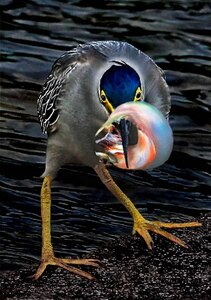高谷さんの写真展示の前で、ご婦人二人が熱心に鑑賞されていましたので、「ここが鳥の頭で、きれいな魚をくちばしで捕らえた瞬間の写真ですよ。」と、説明員よろしくお話しすると、随分感心されていました。