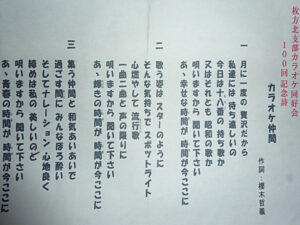 今回は100回目の記念すべき例会と云う事で、宮北会長から挨拶をさせて頂いたあと、枚方北支部の庄子支部長がご多用のところわざわざ駆けつけて頂き、記念のお言葉を頂きました。また、会員の中で、日頃から作詩活動をされておられる櫻木さんが、「枚方北支部カラオケ同好会100回記念詩」を作られました。写真 を添付させて頂きますのでご覧下さい。