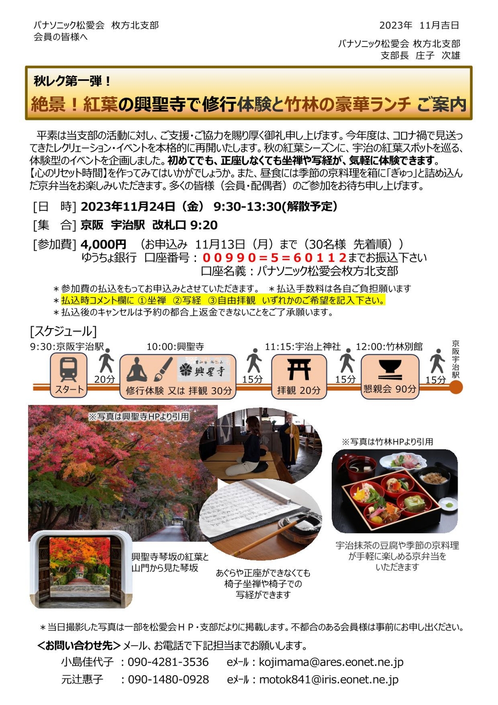 2023.10.30 支部の活動・情報, 支部行事予定 2023年度秋レク第一弾のご案内(絶景!紅葉の興聖寺で修行体験と竹林の豪華ランチ) 投稿者: 宮元 支部の活動・情報, 支部行事予定 コメント: 0