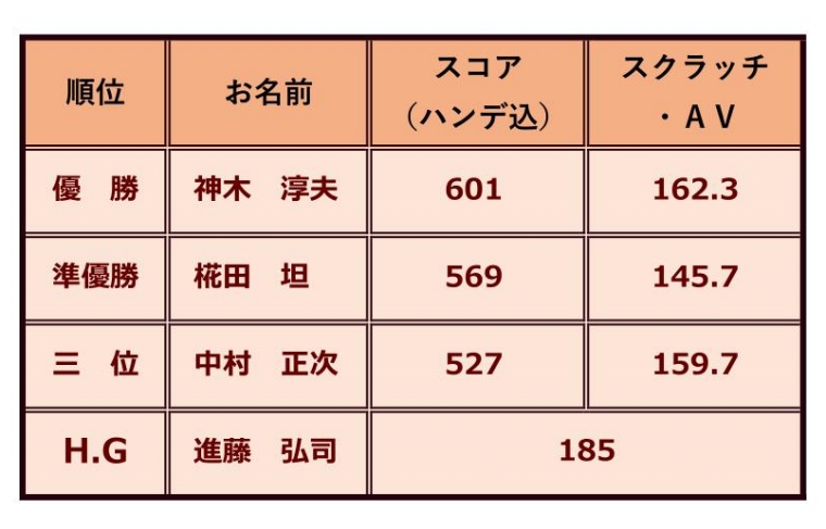 優勝は、今期あまり調子が上がっていなかった神木淳夫さんが、安定した高得点を出し、久しぶりの2回目優勝の栄冠に輝きました。