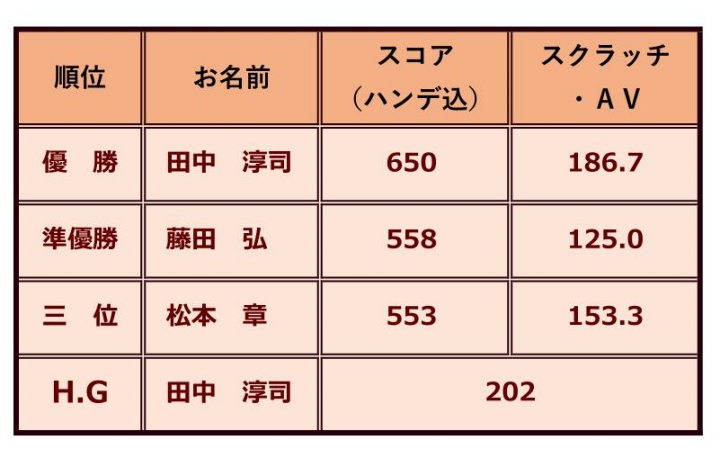 2位には、しばらく足の故障で休まれていた藤田弘さんが、多くのハンディキャップもあり3位に5ピン差で逃げ切りました。
