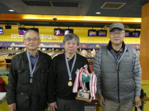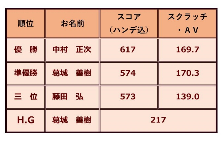 2位には、1ゲーム目に200アップのゲームをだし、その後尻すぼみながら3位に1ピン差で逃げ切った葛城善樹さんがはいりました。