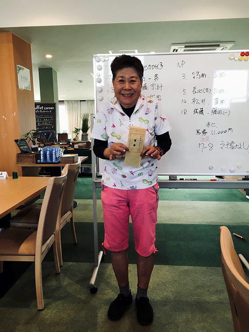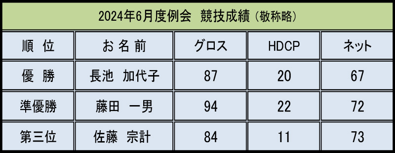 優勝は長池 加代子さん。グロス 87 、ネット 67の好スコアで、昨年10月以来(通算4回目)の優勝を飾られました。おめでとうございます。