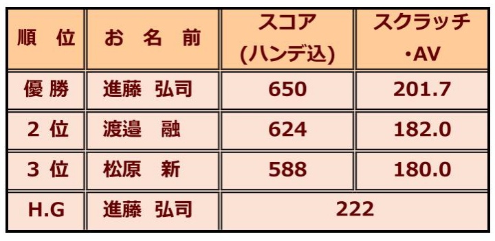 今月の月例会では進藤弘司さんが200点以上のスコアを連発、スクラッチで600ピンを超えるハイスコアを達成して通算9回目の優勝を果たしました。