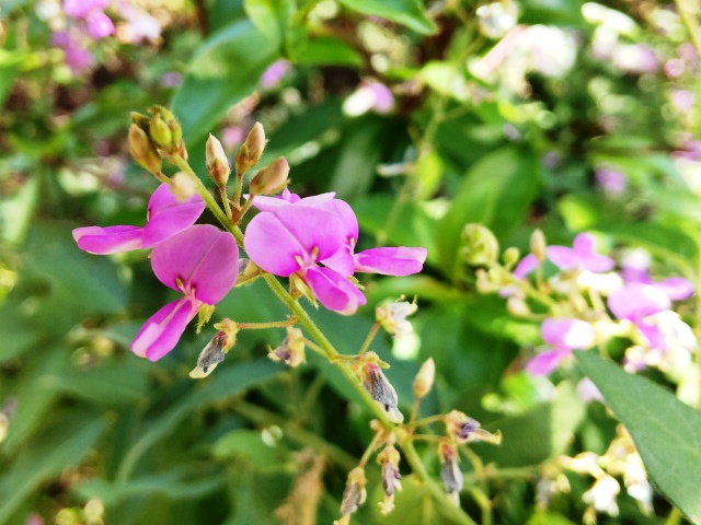 例年のごとく庭に萩もどきの花が咲きました。ウィキペディア(Wikipedia)によるとアレチヌスビトハギ(荒れ地盗人萩、学名:Desmodium paniculatum)は、マメ科シバハギ属の多年草、北アメリカ原産の帰化植物で、1940年に本種を大阪府で採集した、岡山県の植物研究家の吉野善介によって命名されたとあります。