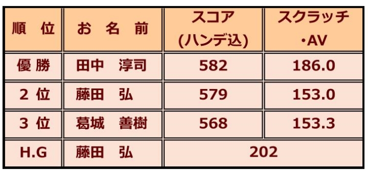 今月の例会では、田中淳司さんが3ゲームとも高スコアを記録し、今期2回目、通算3回目の優勝を果たしました。