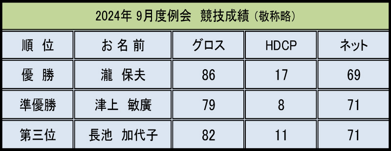 優勝は瀧 保夫さん。グロス 86 、ネット 69の好スコアで、2022年4月以来(通算 5回目)の優勝を飾られました。おめでとうございます。また、全体スコアも上昇し、ネットスコアがアンダーパーは17名中4名でした。