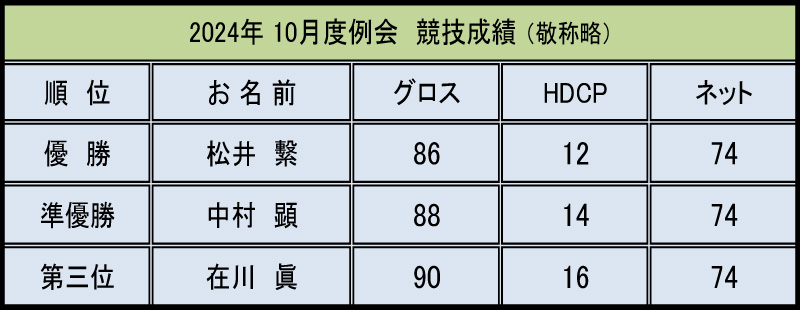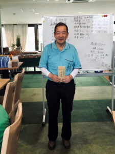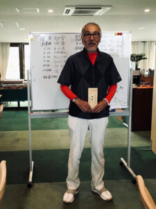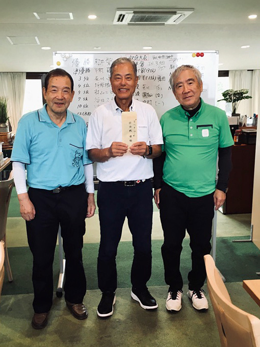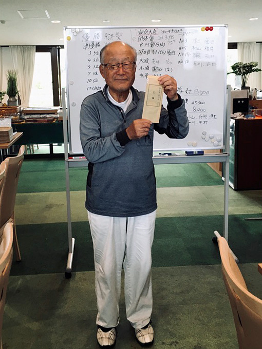 優勝は松井 繫さん。グロス 86 、ネット 74のスコアで、また淀川オープン48回目の参加で、念願の初優勝を飾られました。おめでとうございます。今回、記念大会として団体戦も行われ、IN2組(中村 顕、畑中 幾男、谷口 久重)の皆さんが、ネットスコア 75.4(3人平均)で優勝されました。その他特別賞として、ゾロ目賞(11位:藤田一 男さん)、BM賞(13位:石川 繁さん)、大波賞(在川 眞さん)、小波賞(村山 三郎さん)、水平賞(中村 顕さん)が授与されました。