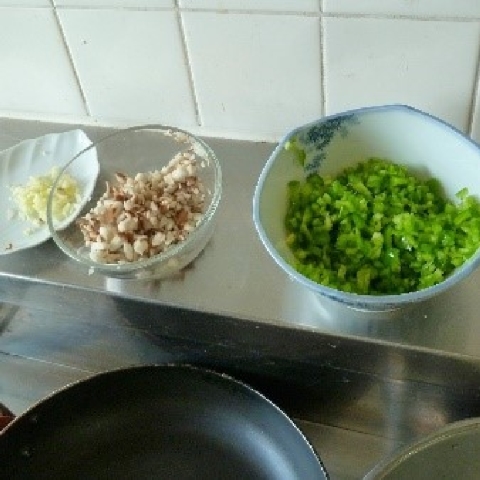 トマト、ピーマン、しいたけ、みじん切りにして置く・・・・A