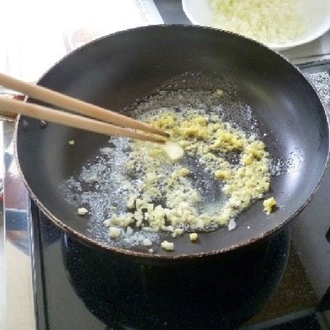 - フライパンにバターとサラダ油を入れ、にんにく、しょうが、の香りが移るように弱火で炒める。・・・B