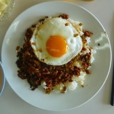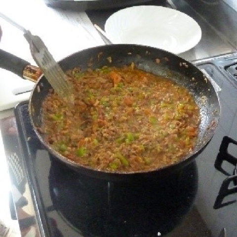- きつね色の玉ねぎにミンチを加え、更に水とカレー粉、香辛料を加えて煮詰めるがシャバシャバの状態から水分が無くなる迄煮詰める。