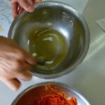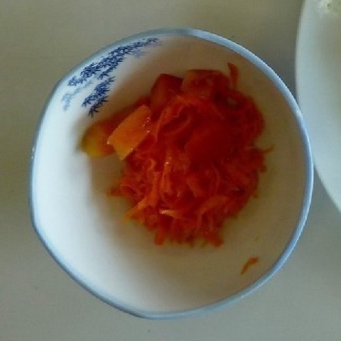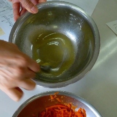 - にんじんの水けをよく絞ってドレッシングを加え、和える。
