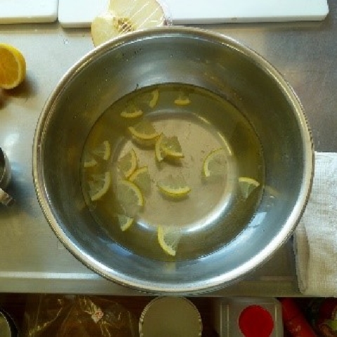 - 鍋に、水、グラニュー糖、レモンを入れ、沸騰したら火を止める。