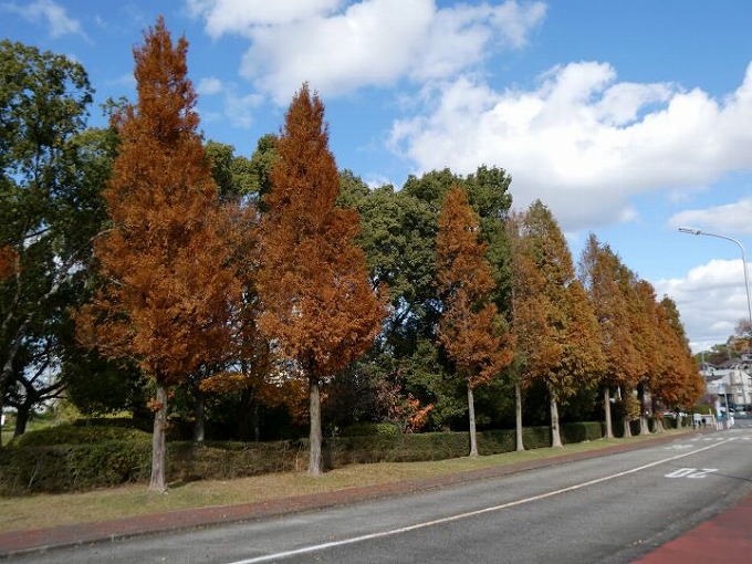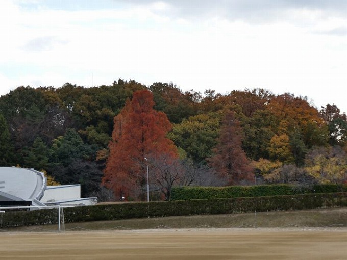 のバレーボールの練習風景は見ることはできませんが、ファイト溢れる声は受付まで響いてきています。そしてメタセコイアの緩やかな坂を登ってコートへ向かいます。登った先のグランドから後を振り向くと、光雲荘(幸之助創業者西宮宅を移転した建物)の借景の森があり、そこは春には新緑、秋には紅葉が見える気持ち良い眺めがあります。