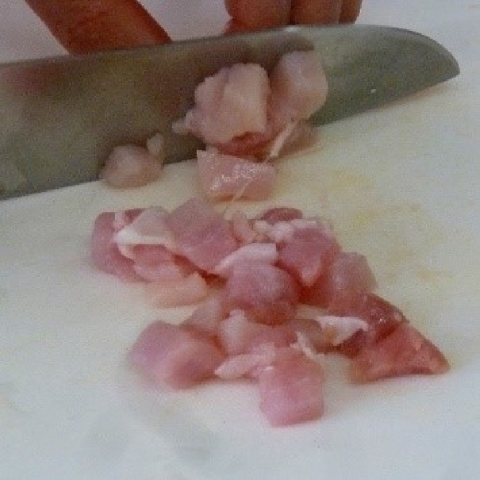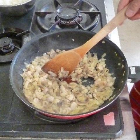 フライパンにバターを溶かし、鶏肉、たまねぎ、マッシュルームを炒める。