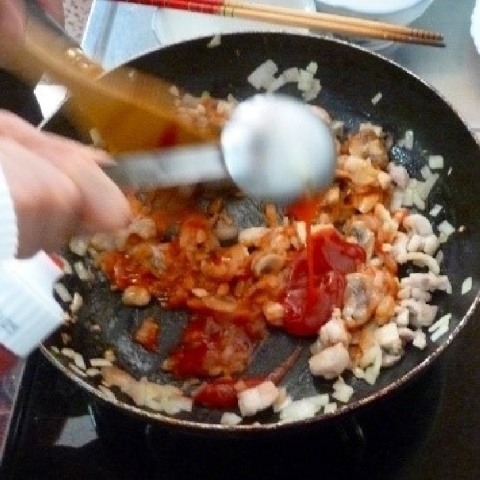 たまねぎが透き通ってきたら、トマトケチャップを加えてから水分を飛ばし炒める。