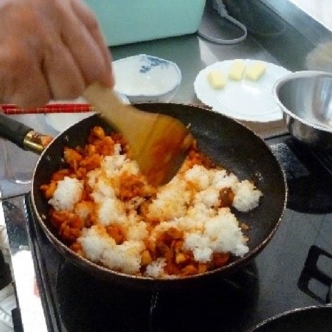 - ご飯を加え、白ワインを振り入れ木しゃもじでご飯をほぐすように混ぜる。