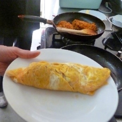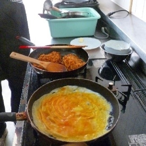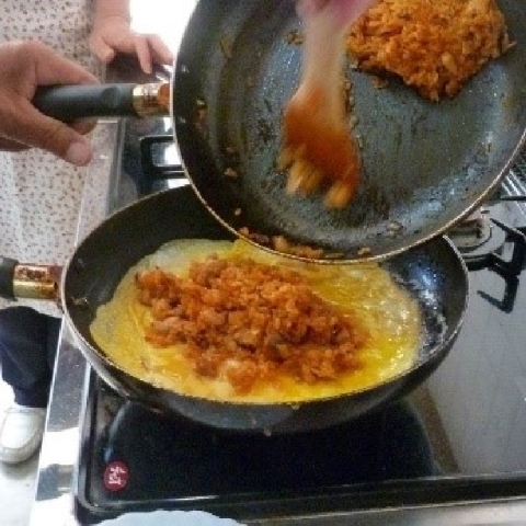 - ご飯が冷めると卵が包みにくくなるので、ご飯を冷まさない。