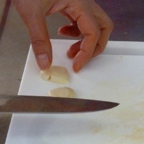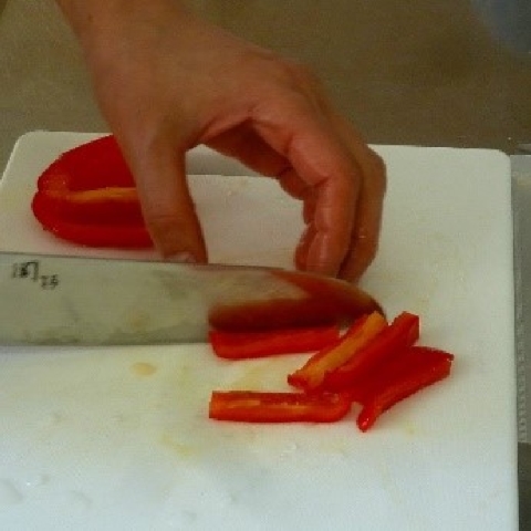 - かぼちゃはいちょう切り、パプリカはくし切りにする。たまねぎは、繊維を断ち切るように1㎝幅に切る。にんにくは、縦半分に切り、包丁の腹でつぶす。