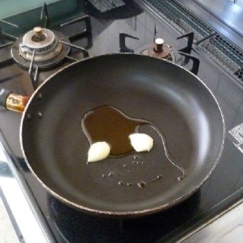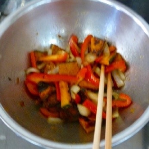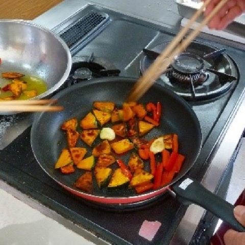 ボウルに酢、塩、胡椒を入れ、泡立て器で混ぜ、EXバージンオイルを少しずつ入れて乳化さ、鷹の爪を加える。 - フライパンにオリーブオイルとにんにくを入れ、火にかけ香りが出てきたら、かぼちゃを並べ、両面焼けたら、ドレッシングに入れる。続いて、パプリカ、たまねぎを焼き、火が通ればドレッシングに加える。