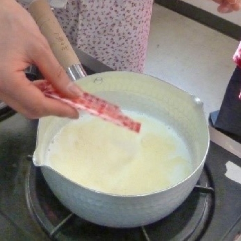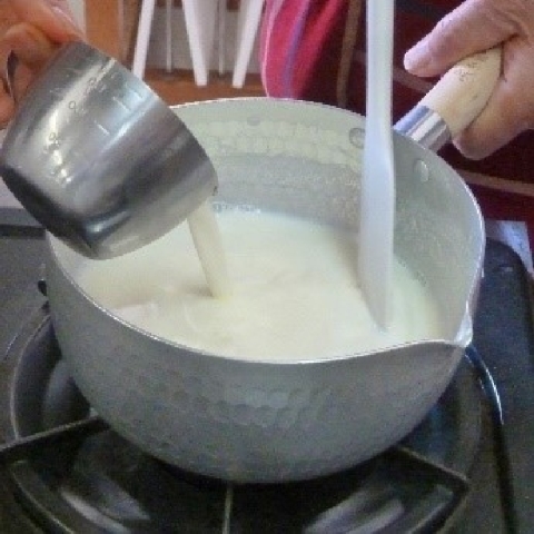 - 鍋に牛乳と砂糖を入れ温めて砂糖を溶かす。