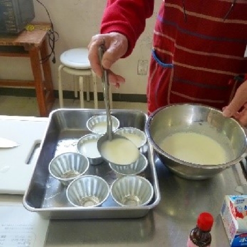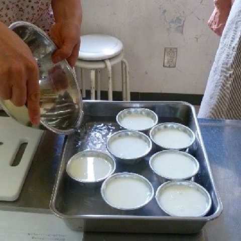 - 器に流し入れ、水で冷やし粗熱を取りその後、パレットの水を流して冷蔵庫で冷やす。