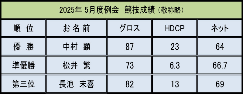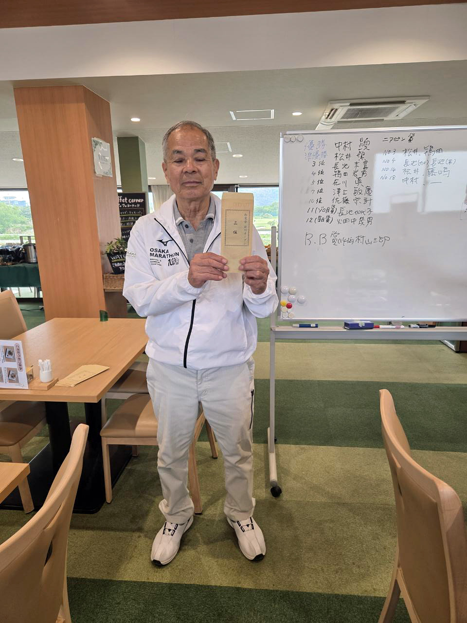 優勝は中村 顕さん。グロス 87 、ネット 64の好スコアで、2023年12月以来(通算 2回目)の優勝を飾られました。おめでとうございます。今回、記念大会として団体戦も行われ、OUT4組(中村 顕、鴇田 岩男、谷口 久重、瀧 保夫)の皆さんが優勝されました。その他特別賞として、ゾロ目賞(11位:長池 加代子さん)、BM賞(15位:小山 吉雄さん)、大波賞(谷口 久重さん)、小波賞(在川 眞さん)、水平賞(津上 敏廣さん)が授与されました。淀川オープンのベストグロスは、2019年9月に「くずはゴルフリンクス」がリニューアルオープン以来、「7 7」のスコアが記録されていましたが、今回、準優勝の松井 繁さんが「7 3」の素晴らしいスコアで新記録を樹立しました。