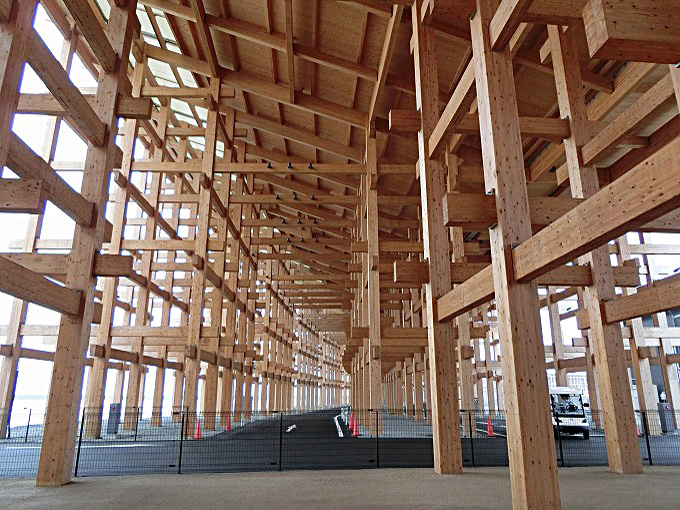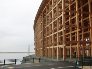 次に、海外館を見学するため「eMover」で「西ゲート北ターミナル」から「リング東停留所」まで移動しました。途中、海に突き出した大屋根リングの下を走り、この停留所付近では海に面した「大屋根リング」が見られます。ここから海外館の一部があるエンパワーリングゾーン」に向かいました。