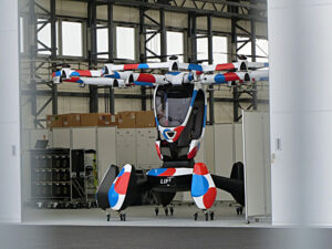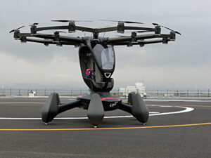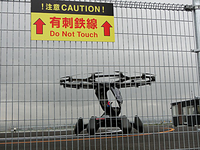 「eMover」の「東ゲート北停留所」から「西ゲート北ターミナル」まで約15分で「フューチャーライフゾーン」に到着。すぐそばにモビリティーエクスペリエンス」の場所があり、「空飛ぶクルマ」が駐機していました。当日は実演されていなかったので機体をじっくり観察することができました。機体の駐機エリアは「有刺鉄線」の注意書きがあり、セキュリティが強化されていました。また、機体は2機あり、展示機以外の他の機体は「ミャクミャク」の装飾をまとい格納庫に保管されていました。