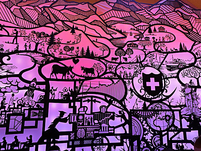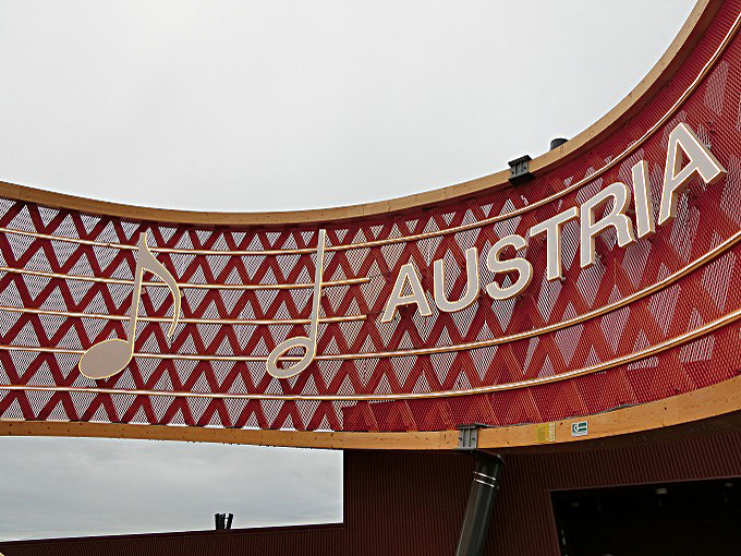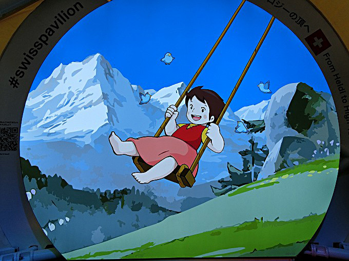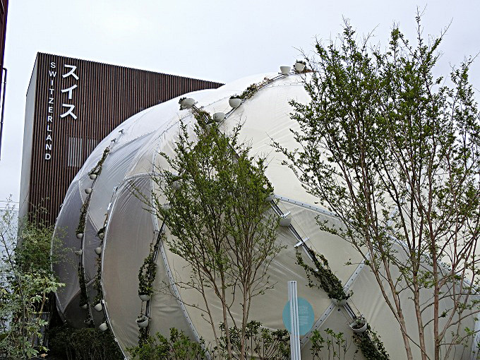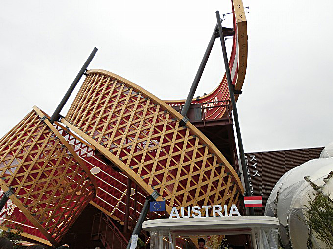 「エンパワーリングゾーン」では最初に「オーストリア館」を見学。音楽の国らしく五線譜と音符で装飾したパビリオンです。館内にはオーストリアの”Bösendorfer“のピアノに葛飾北斎作『富嶽三十六景』中の「神奈川沖波裏」を描いた名機が展示されており、芸術の国際的連携の粋を感じました。3Fにはレストランがあり、エスプレッソと音楽でオーストリアの雰囲気を楽しみました。隣接する「スイス館」に入るとスイスの「切り絵」の作品の精緻さに感動しました。またスイスでは「アルプスの少女ハイジ」が代表的シンボルであり、自然と技術、多様な生活のつなぎ役として登場していました。次に近隣の「UAE(アラブ首長国連邦)」がすぐ入れそうでしたので入館すると、大地から天空へと伸びるナツメヤシをシンボルとして、宇宙探査、医療革新、持続可能な未来を切り拓くストーリーを展開していて、見所がありました。世界は想像する以上に進歩していることを実感しました。