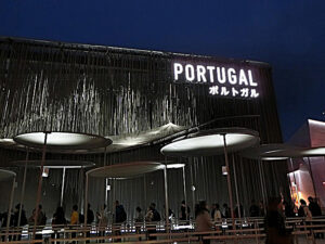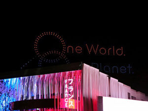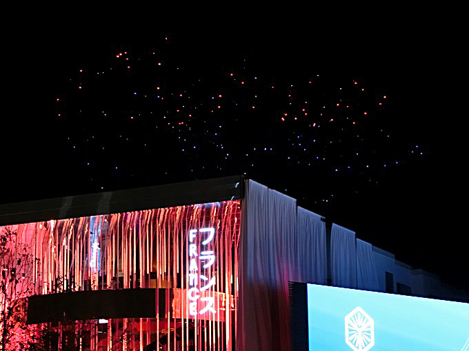 夜も大分遅くなり、「ポルトガル館」に行列ができているのを横目に見ながら帰宅することにしました。東ゲートに向かう途中、空を見上げると「フランス館」の上空では「ドローンショ-」が始まっていました。ドローンが星座のようにキラキラ輝く場面や、「One World」という文字を夜空に表示する場面など、非日常的で大変神秘的でした。